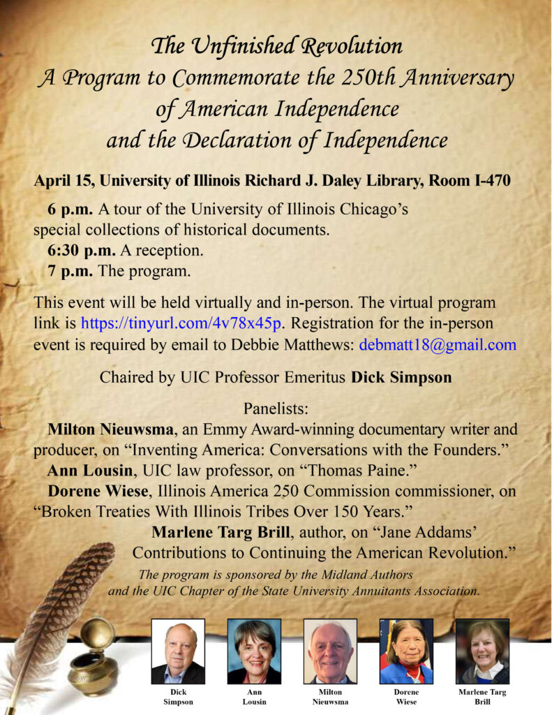 The program is sponsored by the Midland Authors and the UIC Chapter of the State University Annuitants Association.